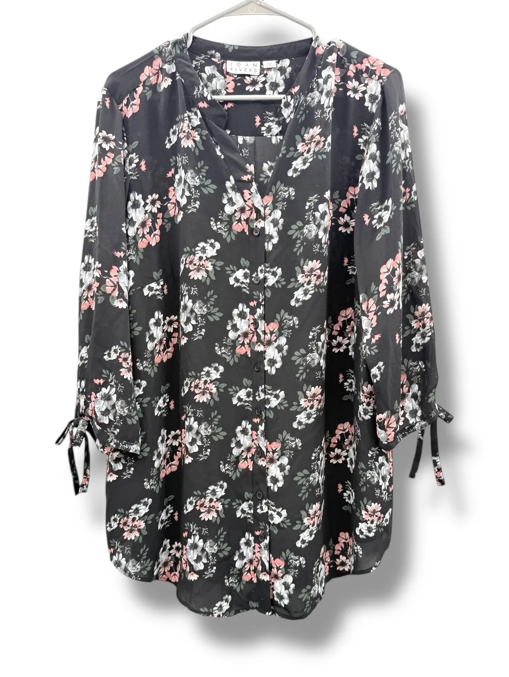 Elevate your everyday and workwear wardrobe with this elegant Joan Rivers floral tunic blouse. Designed with a flattering longer length and lightweight drape, this piece pairs effortlessly with trousers, leggings, or denim. The soft black base with pink and white floral print offers timeless versatility, while the adjustable sleeve ties add a feminine, polished touch. Details: Brand: Joan Rivers Color: Black with pink & white floral print Style: Tunic blouse Neckline: Split V-neck Sleeves: Long sleeves with adjustable tie cuffs Closure: Button front Fabric: Lightweight woven; 100% polyester Fit: Relaxed, flowy silhouette Occasion: Workwear, business casual, everyday wear Size: 18W Condition: Excellent Approx. Measurements: • Bust: 21.5 in • Length: 33 in Joan Rivers blouse, floral tunic top, plus size blouse, women's 18W top, black floral blouse, pink floral top, workwear blouse, office tunic, long sleeve blouse, flowy blouse, business casual top, QVC brand, plus size workwear
