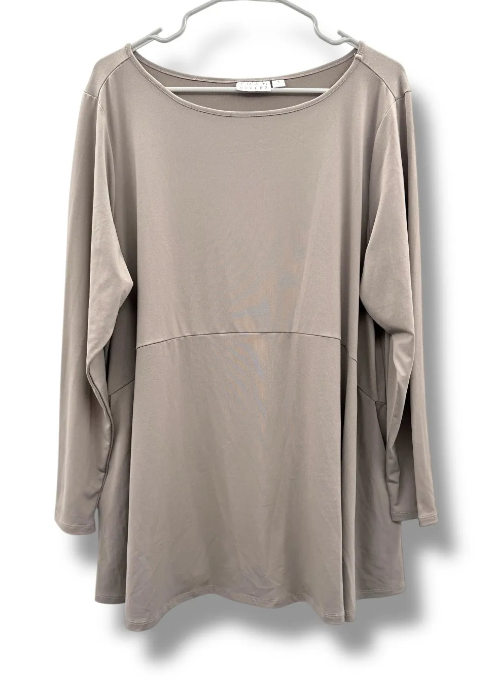 Effortlessly chic and endlessly wearable, this Joan Rivers minimalist tunic top is the perfect elevated basic for everyday style. Designed with a clean silhouette and soft stretch fabric, it drapes beautifully for a flattering, comfortable fit. A timeless neutral that works year-round for casual wear, travel, or polished layering. Details: Brand: Joan Rivers Color: Taupe / Greige Neutral (first photos are showing lighter than in person, tag picture is most accurate color) Style: Tunic Top Neckline: Wide Scoop / Boat Neck Sleeves: Long Sleeve Fit: Relaxed, flowy silhouette Fabric: polyester/spandex Length: Tunic length – great with leggings or slim pants Design: Minimalist, clean lines, no graphics Size: 1X Condition: Excellent Approx. Measurements: • Bust: 24.5 in • Length: 30.5 in Joan Rivers top, minimalist tunic, taupe tunic top, plus size tunic 1X, stretch knit top, neutral long sleeve top, casual tunic women, flowy tunic blouse, capsule wardrobe top, comfy chic top
