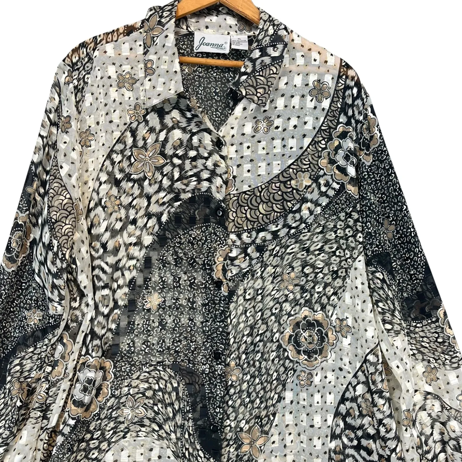 A vintage Joanna blouse that masterfully combines animal and floral prints in a unique patchwork design. This long-sleeve, button-up top features a mix of leopard, zebra, and floral patterns in a neutral color palette. Measurements: • Chest: 25 in • Sleeve: 24.5 in • Length: 30 in Color: Black Type: Blouse Department: Women Material: Polyester Neckline: Collared Sleeve Length: Long Sleeve Sleeve Type: Classic/Fitted Sleeve Accents: Button Pattern: Floral Features: Sheer, Lightweight, Button-Up, Long Sleeve, Patchwork Fit: Regular Ships in 1-2 business days.