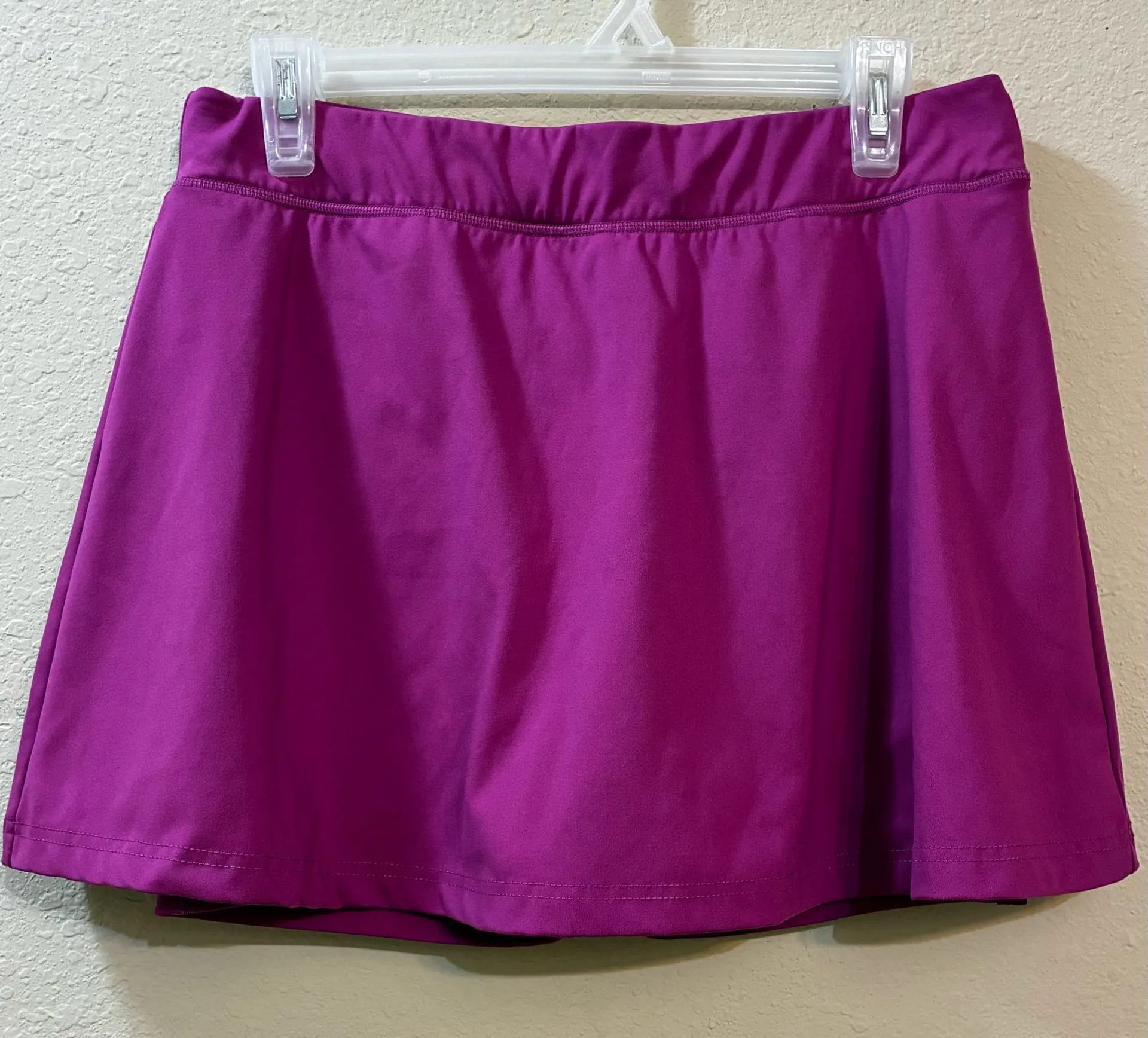 Jockey Women's Performance Skort or athletic skirt with built-in shorts. Soft, stretchy, moisture-wicking fabric- polyester and spandex blend. Wide comfortable elastic waistband and built-in shorts Has pockets on shorts Color: solid magenta/fuchsia/purple. Size: Medium Waist laid flat: 15 inches Lenght: 14 1/4 inches Gently worn. Very good condition, no tears or wear nor stains.