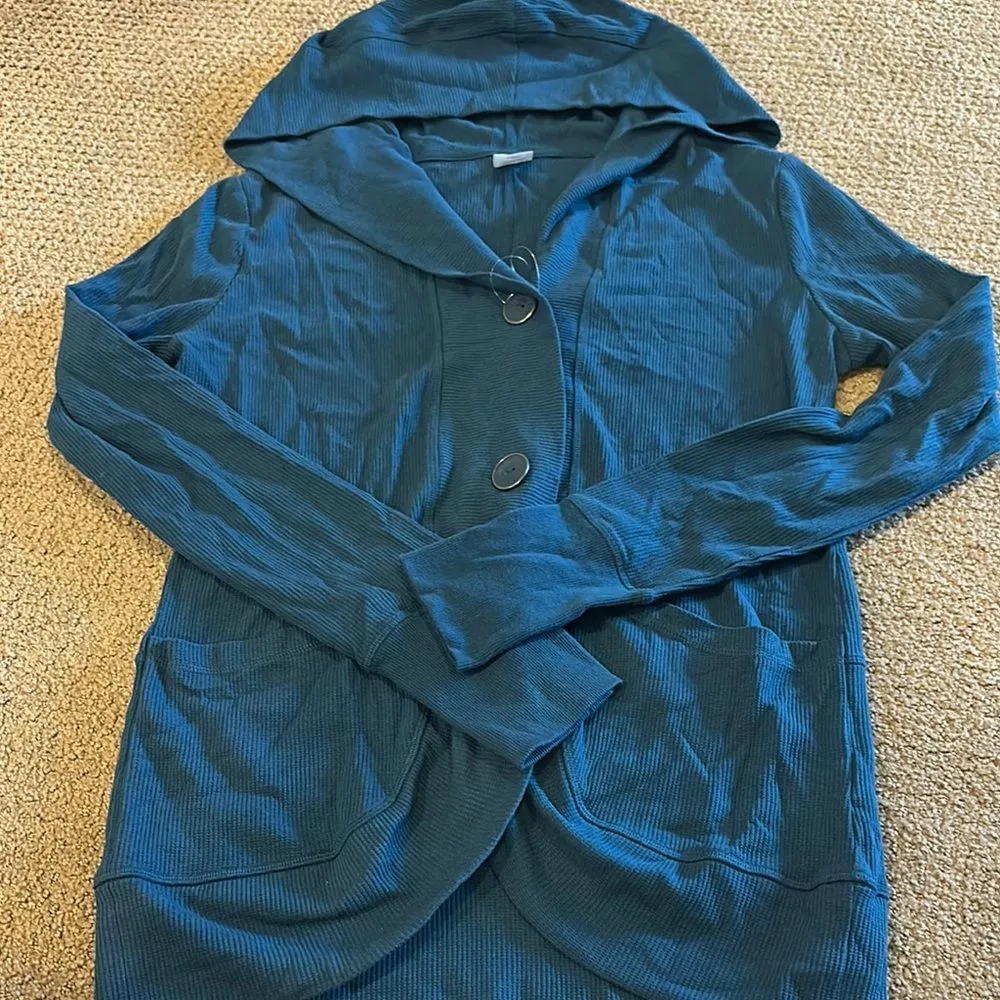 Jockey Women’s Teal Waffle Hooded Long Cardigan with Pockets - Size L. Stylish teal hooded cardigan with front pockets and button closure. Perfect for layering. 19.5” pit to pit and 26” shoulder to front hem. NWT.