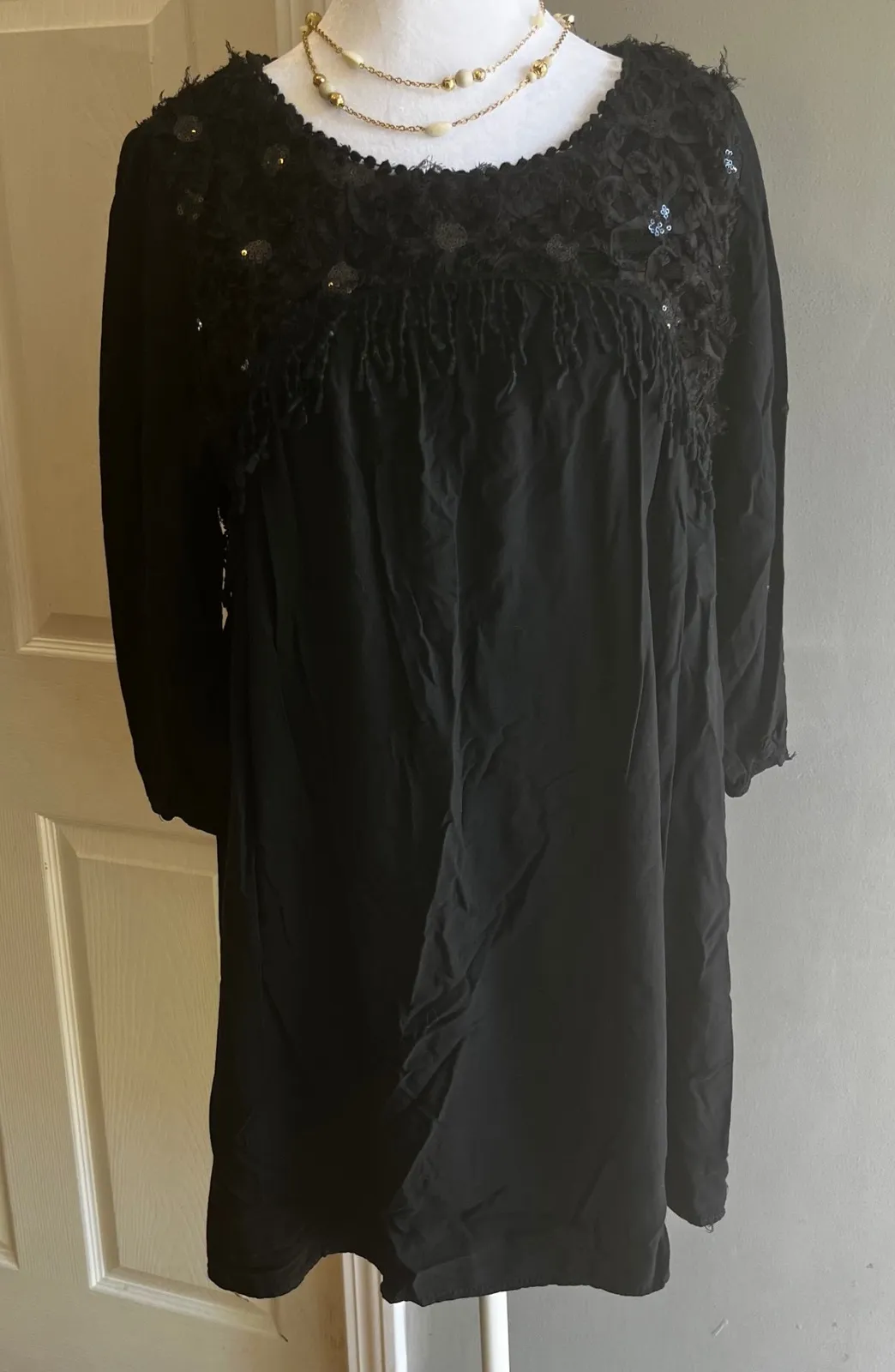 Sultry silhouette unveils your free spirited charm with this black dress. A whimsical bohemian style featuring a beautiful lace and sequin embellished yoke, adding a touch of sparkle and texture. The long sleeves and flowing tunic design create a relaxed and comfortable fit. Ideal for a casual day out, a bohemian-themed party, or an evening concert. Keywords: black dress, lace dress, sequin dress, bohemian dress, long sleeve dress, tunic dress, embellished dress, casual dress, party dress, festival dress Thanks for Looking!