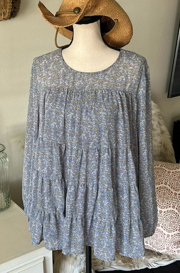 Questions? Leave a comment below! Beautiful boutique, long semi sheer, balloon sleeve, baby doll tiered, ruffle, cottage light blue Prairie blouse top size large see measurements, good condition Lined Offer and bundle ❤️ ✌️ Cottage Prairie lightweight work office party Cowgirl western rodeo spring summer VICI boheme Fall