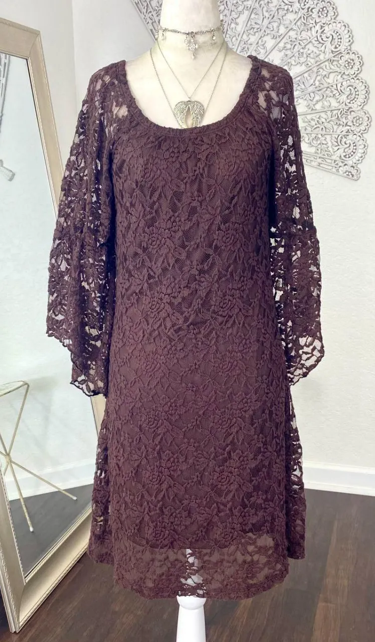 🥀 Whimsygoth Fairy Lace Bell Sleeve Midi Dress 🥀 ༓ Brand: Jody California Made In USA ༓ Size: M ༓ stunning dark brown lace dress ༓ round neckline, wide flowy 3/4 bell sleeves ༓ full floral lace, brown satin lined ༓ the perfect witchy whimsygoth celestial ethereal dress ༓ pits 18" ༓ single waist 15" ༓ length 39" Tags: #fairy #whimsical #whimsygoth whimsigoth #goth grunge witch #witchy bohowitch pirate vampy vampire ren renfair moody dramatic castlecore