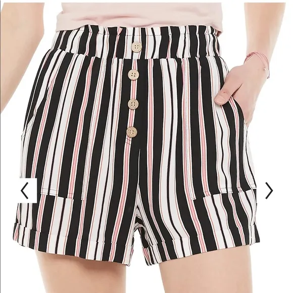 PRODUCT FEATURES Button front detail High Rise/ High Waist / High Waisted 2 porkchop pockets Challis construction Sewn-rolled hem Dressy Shorts FIT & SIZING Hidden elastic waistband Inseam length: 2 3/4" Regular fit FABRIC & CARE Rayon Machine wash Imported Size Small Slightly wrinkled from being shoved in a drawer and I don’t have an iron.