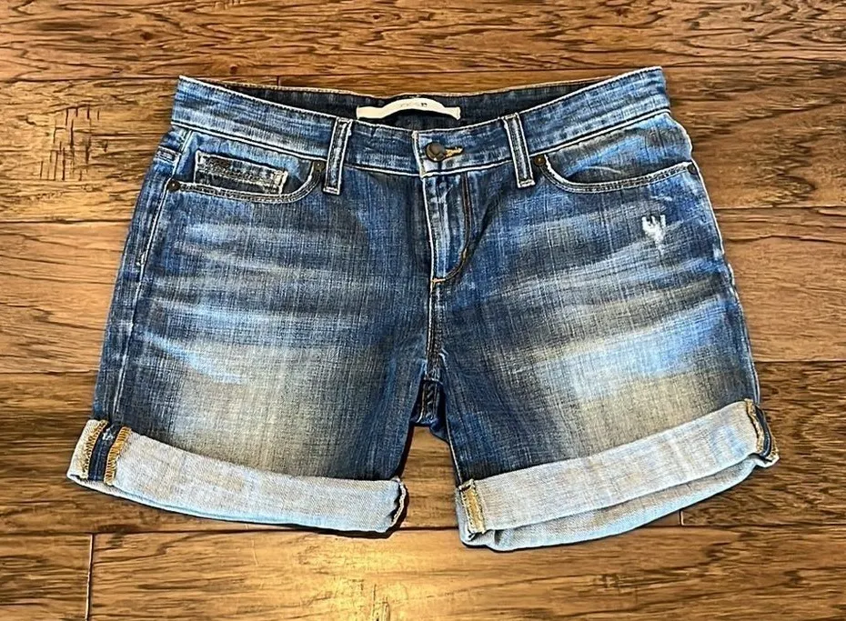 Front zipper and button Waist 15 1/2” Inseam 5” Rise 8” 100% cotton Fading and whiskering Light d... Show more