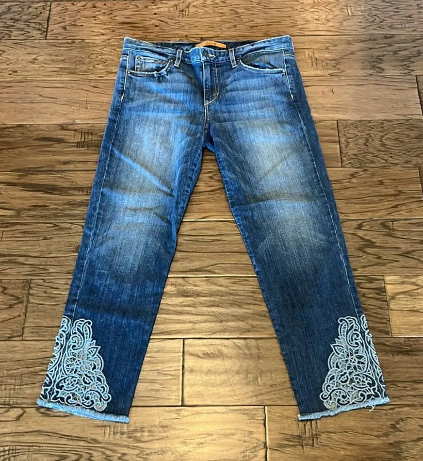 Front zipper and button Waist 15 1/2” Inseam 25 1/2” Rise 9” Hip 18” Fading and whiskering Crop Di... Show more