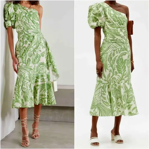 A tropical-inspired floral motif accents this one-shoulder poplin midi while a chic puff-sleeve and ruffle hem add flirty femininity to the piece. One-shoulder neckline Short puff sleeve Concealed side zip Banded waist Ruffle hem Cotton Lining: cotton Dry clean Imported of Italian fabric SIZE & FIT Tailored fit 16" pit to pit flat across waist: 14" flat across length: 48" from shoulder to hem Keywords: one shoulder, hawaiian, puff sleeve, midi, floral print, green, belted, fit and flare, elegant, party, cocktail, summer, spring fashion, vacation, wedding guest, tropical