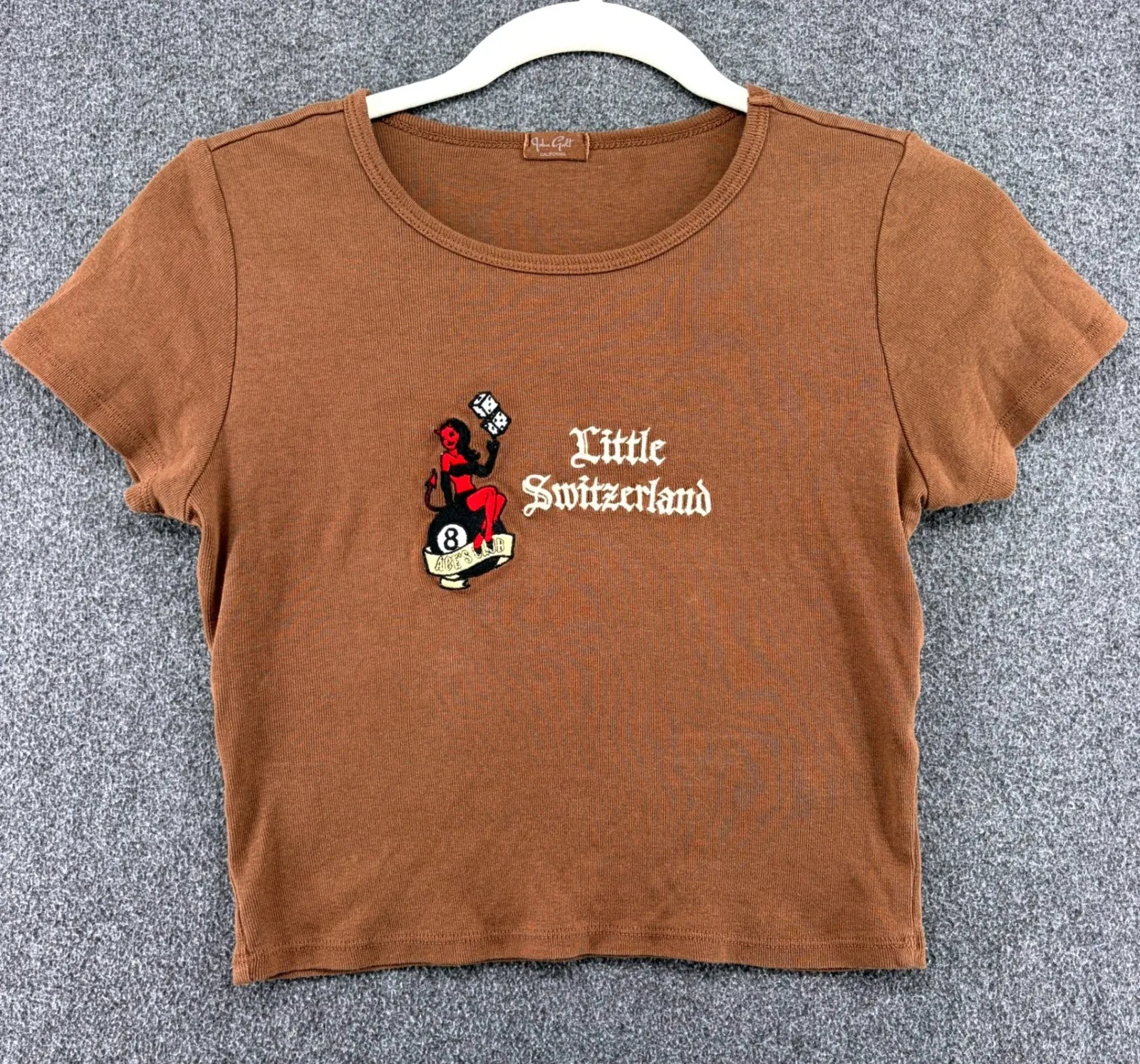 John Galt Little Switzerland Brandy Melville crop top in brown featuring a graphic of a devil sittin... Show more