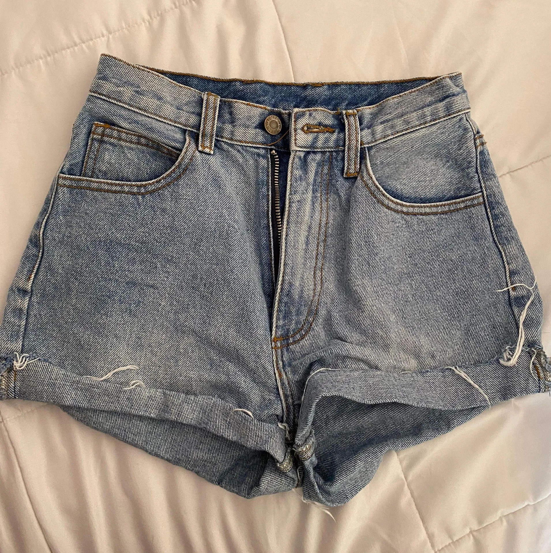 High waisted blue jean shorts in amazing condition. Super cute, just too small on me now! These have... Show more