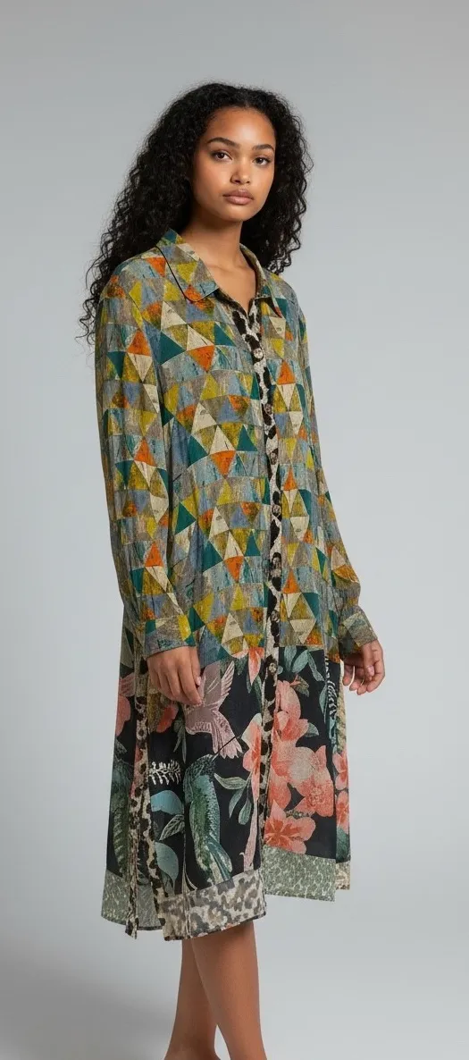 Hi - Low Design Tab Sleeve Option Measurements: • Bust: 22 in • Front ( Hi Low Design) Length: 34 in • Back ( Hi Low Design) Length: 40 in Style: Shirt Dress Dress Length: Midi Department: Women Sleeve Length: Long Sleeve, Tab Sleeve Option Pattern: Patchwork Fabric Type: Woven Neckline: Collared Season: Spring, Summer, Fall, Winter Closure: Button Accents: Button, Layered Features: Collared, Graphic Print, Asymmetric Keywords: John Mark, patchwork, geometric print, floral print, bohemian, artistic, unique, long sleeve, midi dress, collared, button down, designer, fashion, style This item is in good preowned condition. It comes from a non-smoking, pet-free home. • Kindly review all photos carefully before purchasing. • Quick Shipping ! Same or Next Day! • Fabric tags shown in photos If still attached • All measurements are take unstretched and are APPROXIMATE