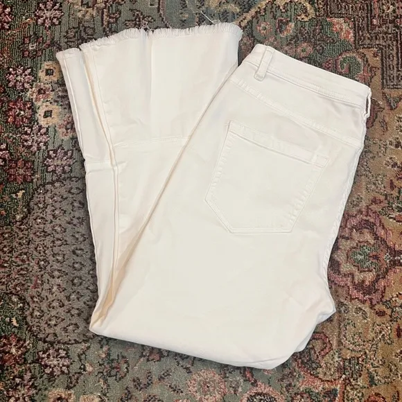 White minimalist color Bell bottom Has stretch Front and back pockets Buttons in the front Has belt loops Great for any season Has small hole in one of the bell bottoms which is pictured