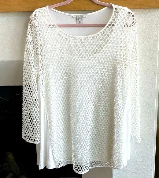 Pretty white top from John Mark. White netting style with built in white tank top. Rayon and spandex. Very beachy and perfect for summer occasions. Excellent, like new condition. Pit to pit 23”, length 28”