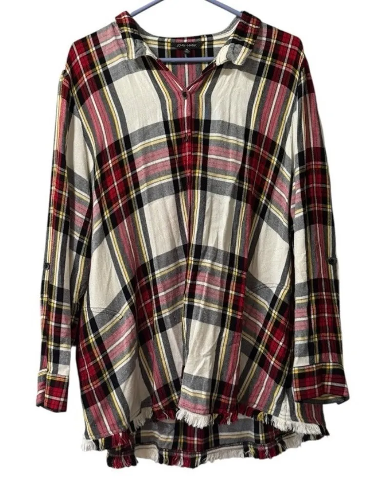 This shirt is preowned and in great used condition! John Mark Women Size XL Plaid Button Up Blouse Top Fringed Long Sleeve Cabincore ***Please be advised, color may appear more vibrant, lighter/darker in pictures due to flash, contrast, lighting or your phone/computer screen set up, etc. I try to described color as best as possible. I do check every item very closely while taking pictures and while packing it for shipping but it is very easy to still miss a stain or small damage. So please, if you receive an item with a defect not mentioned on the description, message me and I will do my best to fix the problem. Thank you! This item is pre-owned. Any questions please dont hesitate to ask.