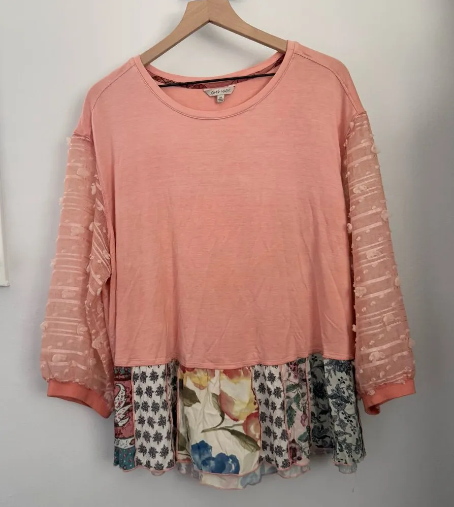 John Mark XL Peach Pink Blouse Relaxed Floral Swiss Dot Sleeve Coquette Boho - $24 - From Most