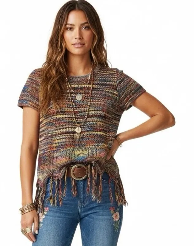 Fringe accents Open-Knit Slim fit Open knit Short sleeve Multicolor pattern Acrylic 100% Acrylic Approx. Measurements: Pit to pit: 17" Length: 25" Bohemian; Hippie; Festival; Indiepop; Quirky; Retro; 70s; 90s; Eclectic