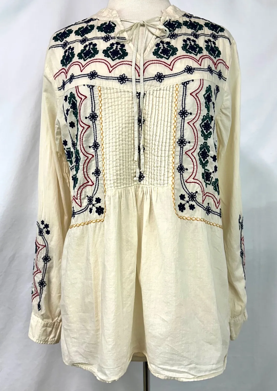 JOHNNY WAS 3J Workshop Embroidered Tunic Peasant Blouse Cream Cotton, Women's M Very well made, lightweight, breathable, and comfortable Has a bow tie neck detail Has a small pin hole on back near collar, see pictures MEASUREMENTS: pit to pit 20in flat across, length 28.5in Type: Blouse Department: Women Style: Tunic Material: 100% Cotton Neckline: Tie Neck Sleeve Length: Long Sleeve Sleeve Type: Casual Sleeve Pattern: Floral Accents: Embroidered, Pleated Theme: Bohemian, Peasant Fit: Relaxed Fabric Type: Woven Closure: Pullover Keywords: embroidered, bohemian, tunic, long sleeve, cotton, designer, patchwork, festival, casual, lightweight, embroidered tunic, womens tunic, embroidered top, embroidered shirt, boho tunic, hippie, Cottage, fairy, ethereal