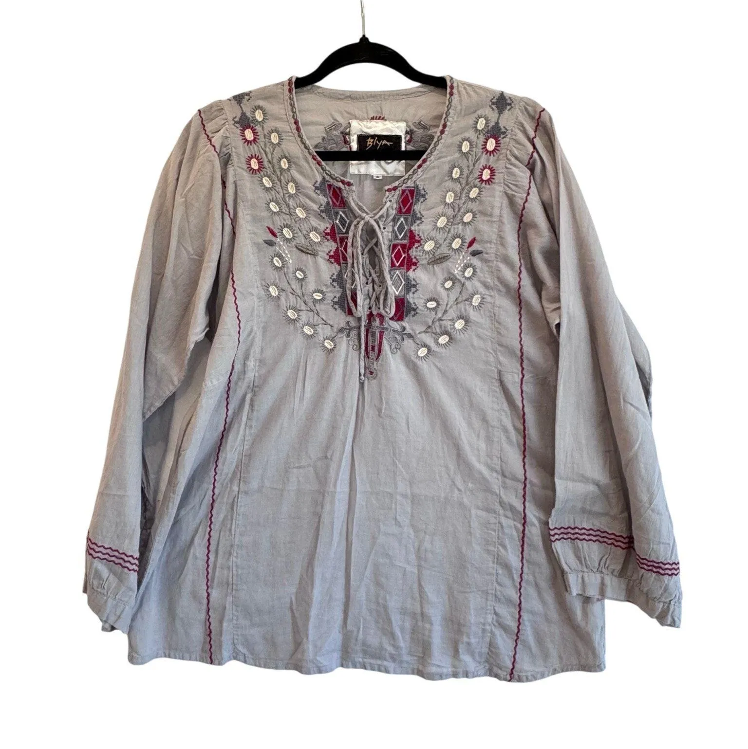 Biya by Johnny Was Women’s size Small Gray tunic blouse with red floral embroidery Lace-up V-necklin... Show more