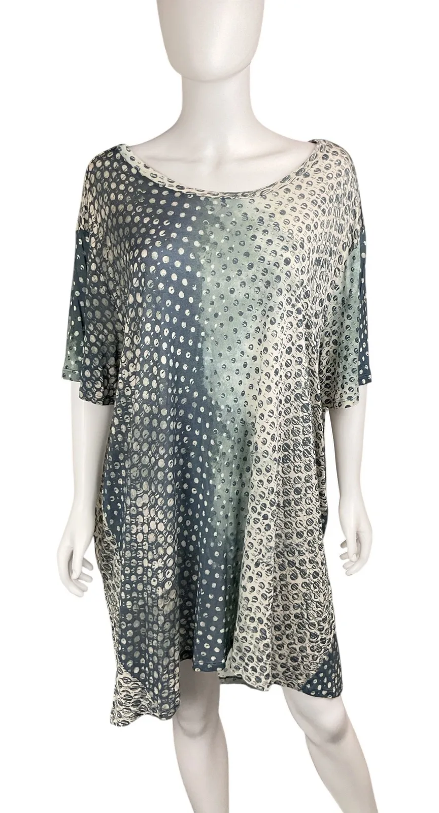 Stylish Johnny Was Biya tunic dress featuring a unique blend of bohemian chic and contemporary design. This comfortable and relaxed fit dress showcases a captivating polka dot pattern in shades of blue and beige, creating a visually appealing and versatile piece. The dress boasts a flattering scoop neckline, relaxed dolman sleeves, and a soft, flowing silhouette that drapes beautifully on the body. Perfect for adding a touch of effortless elegance to your wardrobe, this tunic dress can be dressed up or down for various occasions. Ideal for weekend brunch dates, casual outings, or vacation getaways. Measurements: • Length: 35 inches • Pit to pit: 27 inches Style: T-Shirt Dress, Tunic Color: Blue Department: Women Sleeve Length: Short Sleeve Pattern: Polka Dot Occasion: Casual, Travel Material: Modal Neckline: Scoop Neck Character: Boho Chic, Casual, Polka Dot, Elegant, Relaxed Fabric Type: Knit Season: Spring, Summer, Fall Sleeve Type: Dolman Sleeve Closure: Pullover Keywords: Johnny Was, Biya, Tunic Dress, Blue Dress, Beige Dress, Polka Dot Dress, Bohemian Dress, Casual Dress, XL Dress, Modal Dress, Scoop Neck, Dolman Sleeve, Comfortable Dress, Weekend Wear, Vacation Dress