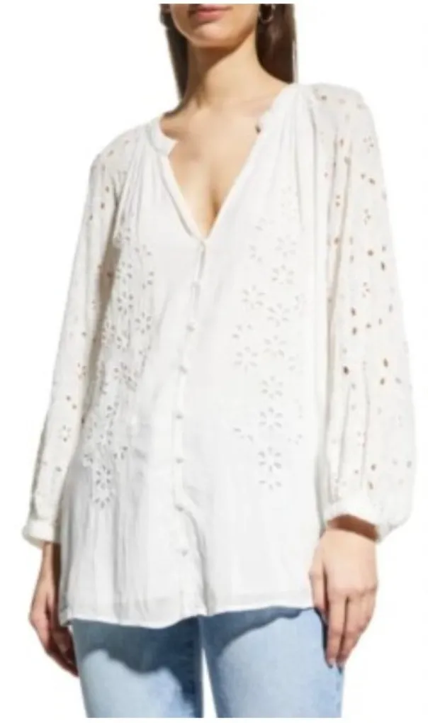 Item: Womens white embroidered eyelet tunic blouse with relaxed boho styling. Tags: Inner size tag r... Show more