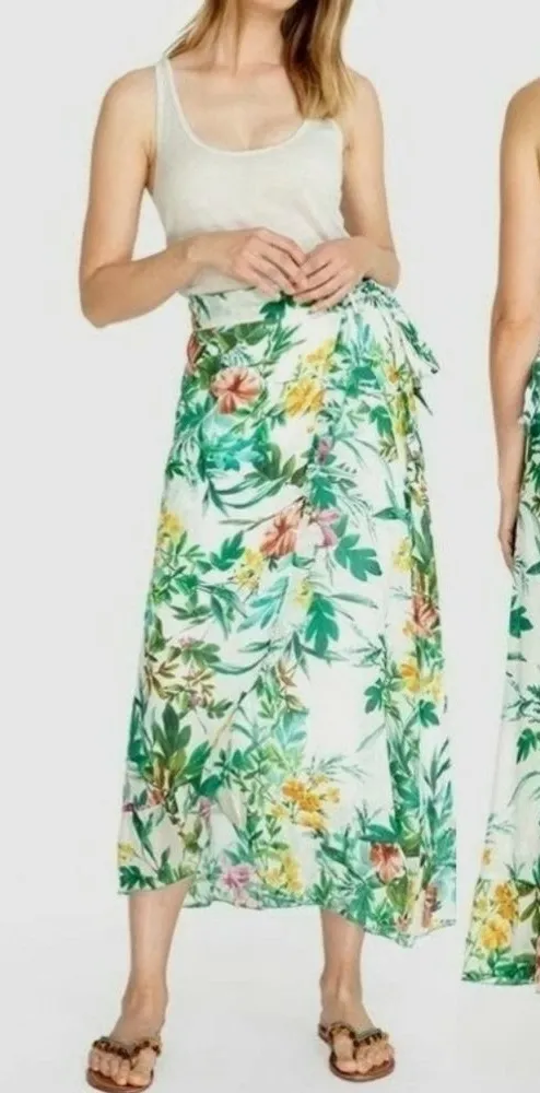 Elevate your resort wear with this elegant cream maxi skirt from Johnny Was. Featuring a chic wrap style with a tie front, it boasts an asymmetrical hem that adds a touch of sophistication. Perfect for casual outings, its light and flowy fabric ensures comfort in warm weather. waist 14 length 38