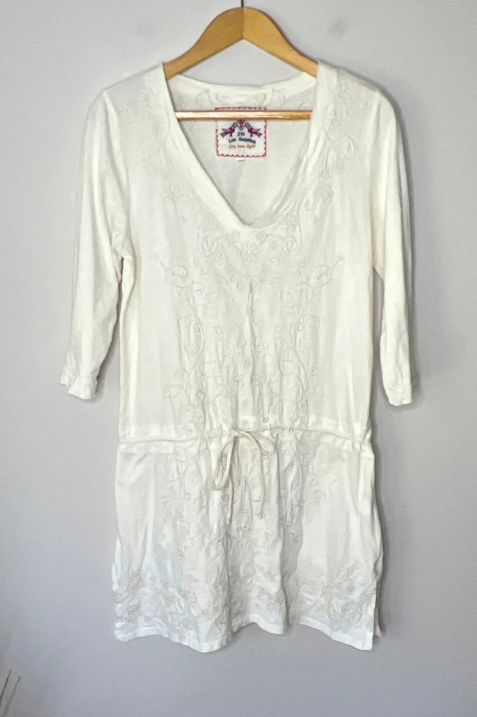 Johnny Was Ivory Embroidered V-Neck Cinch Waist Cotton Mini Dress Size Medium - Gorgeous ivory on ivory embroidery - 3/4 sleeves - side slits - pullover styling EXCELLENT preloved condition APPROX. MEASUREMENTS: *Measurements are taken with item lying flat on the floor. Pit to pit: 20" Shoulder to hem: 33" Thank you for checking out my item! Please let me know if you have any questions. All pre-owned items have been washed according to item label directions, unless dry clean only, and stored in a pet and smoke-free home. *Disclaimer: colors may vary across various viewing devices.