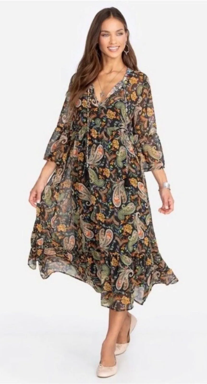 Johnny Was Jade Bryce Maxi Dress in Black Multi Paisley Print. Excellent used condition with no flaws. Size Small. Chest - 20" Length - 50" middle, 55" sides This flowing piece features a flattering V-neckline with tassel tie accents, voluminous bell sleeves, and a tiered hem. Perfect for a beach vacation, a casual brunch, or a music festival. Material: 100% Viscose Lining Material: 100% Polyester Paisley, bohemian, festival, vacation, resortwear, flowy, tassel tie, bell sleeve, tiered hem, v neck, print dress, designer, unique SKU 101325