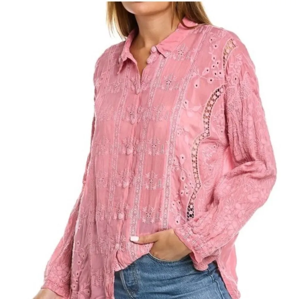 The unconventional floral design of our Blossom Rosie Button Down pairs beautifully with your favorite pair of denim jeans to give you an unforgettable look everyone will be talking about. This chic top features flattering side slits that are sure to highlight the shape you want. Simply pair this piece with a stunning wide-brimmed hat and clutch to build a seemingly effortless trendy look Rayon Side slits Measurements for size small : Length - 26 1/4" , Bust - 23" Excellent condition (16)
