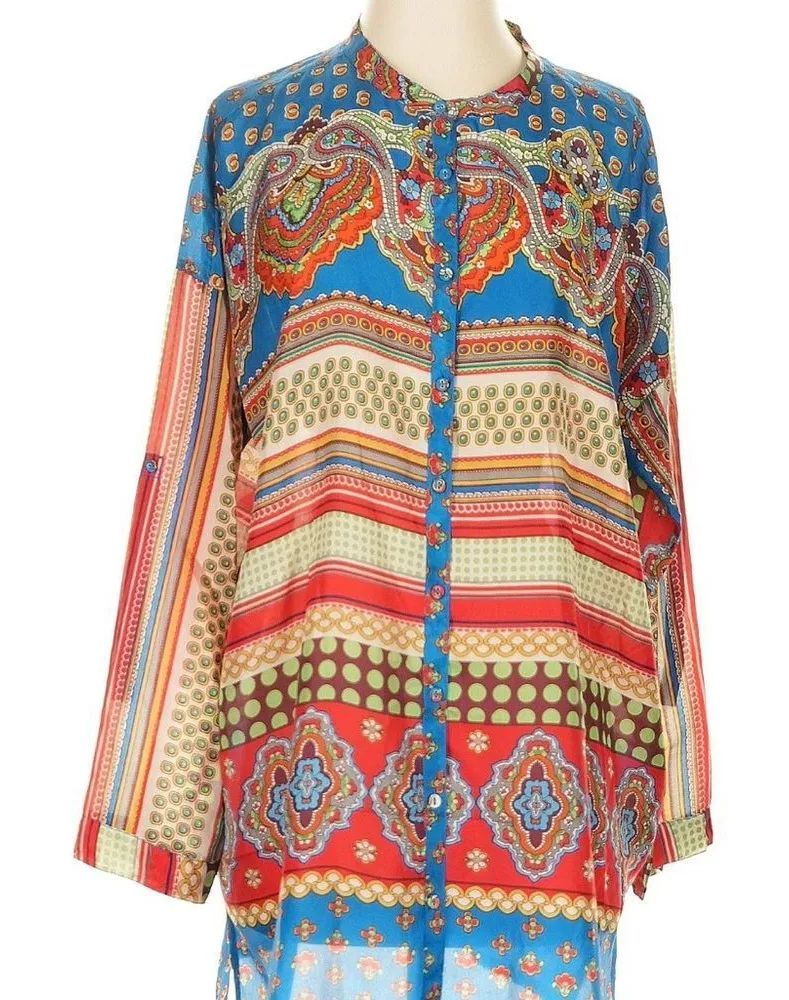 Vibrant blouse with paisley and stripe patterns. Features a button-up front. Perfect for adding color to your wardrobe. Stunning very oversized No issues 100% Silk Mock 3-4 Sleeves Tunic top Blue 34 inches long Pit to pit 27 inches 330