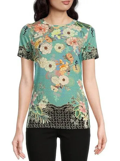 Item #20252704 From JOHNNY WAS, this shirt features: Bamboo knit jersey fabrication Crew neckline Short sleeves Millay floral print Straight hemline Pullover construction Approx. 25.5" length and 16.5" across chest laying flat Bamboo/spandex Machine wash/tumble dry In great pre-owned condition. Gently used, well cared for. No flaws. This short-sleeve t-shirt features a beautiful array of colorful flowers set against a teal backdrop, with a contrasting geometric and floral border at the hem. The design offers a unique blend of bohemian and contemporary styles. Type: T-Shirt Keywords: Johnny Was, Floral top, Print t-shirt, Short sleeve top, Bohemian style, Colorful shirt, Womens top, Casual top, Designer top, XS size, Viscose top, Floral print, Teal top