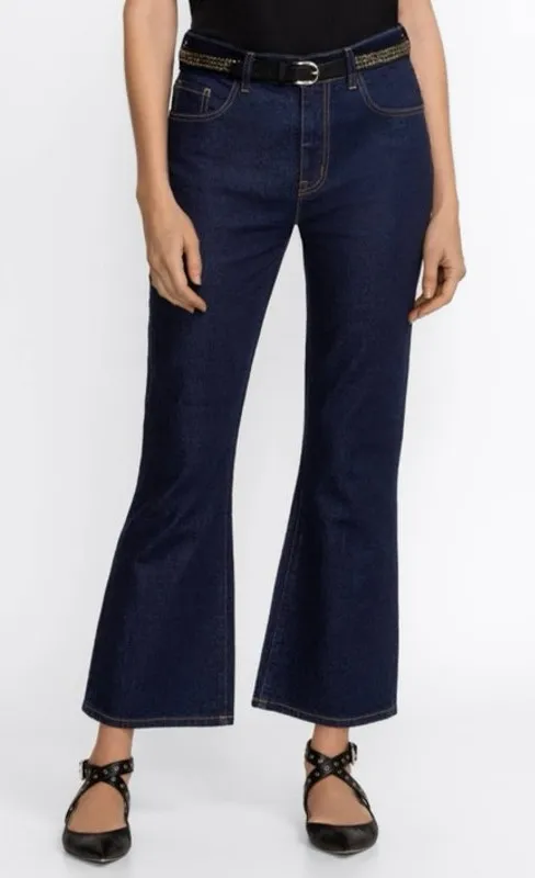. Cropped, bootcut silhouette. Mid rise waist. Zipper fly and button closure. Five pocket detailing. Fitted through the knee that flares out slightly at the hem. 65% Organic Cotton 34% Lyocell 1% Elastane. Machine washable. Style: jw1011nb16. Condition: New with tag. Size: 27. Approx Flat Lay Measurements: Waist: 13.5”. Rise: 11.5”. Hips: 17.5”. Inseam: 25.5”.