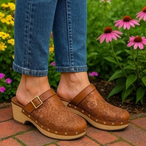 Johnny Was Mono Clog Tonal Slippers Brown Leather Floral Embroidered Garden 7.5 - $100 - From Casey