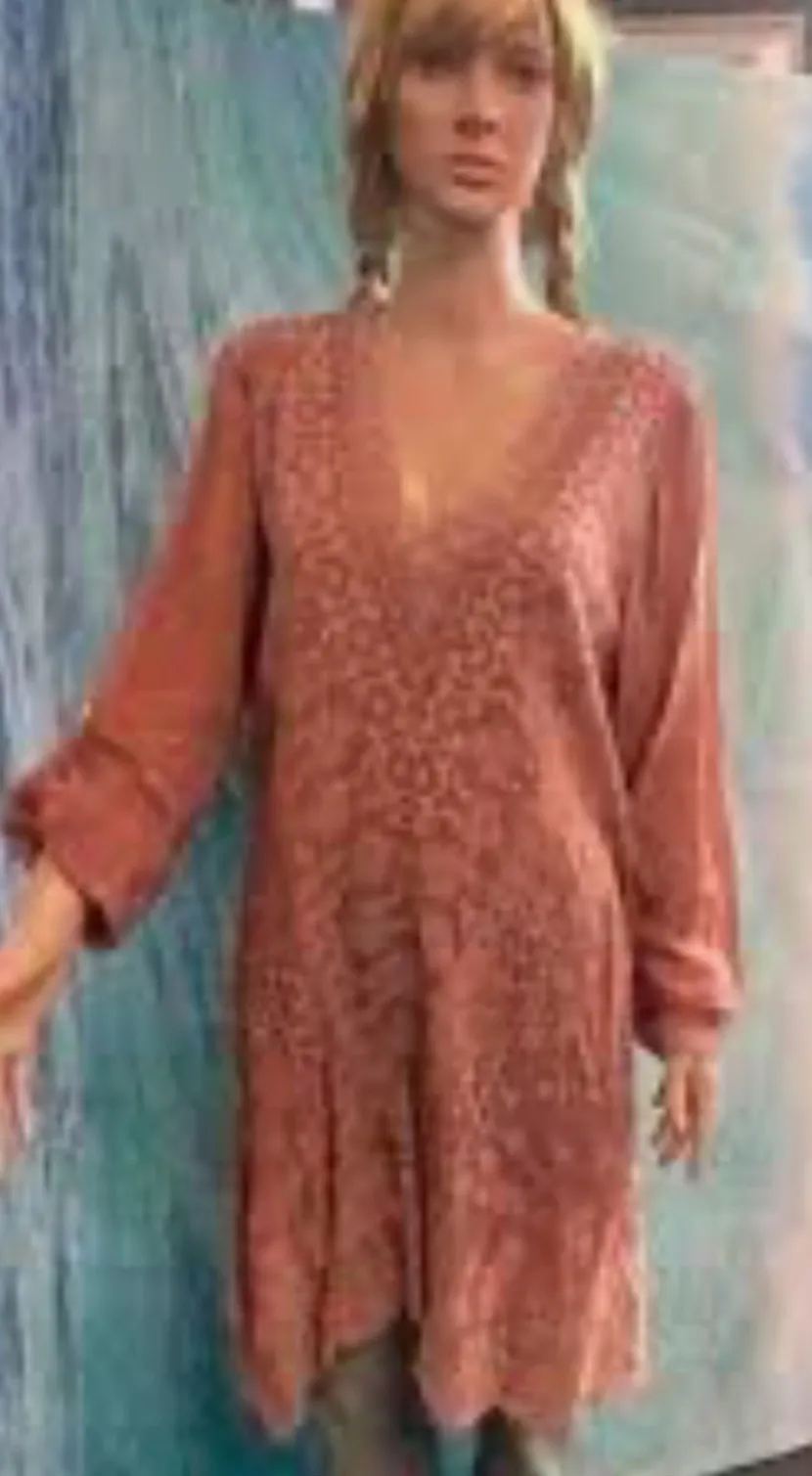 Johnny Was Plus V Neck Embroidered Eyelet Tunic Midi Dress Dusty Rose Size 2X Retails: $325.00 Excellent condition - no stains *Color variation is due to lighting - color is a true deep dusty pink* Optional cuffed button wrist hem Recommend slip underneath - fabric is slightly sheer Size tag has been removed for comfort - please check measurements to confirm fit Small fabric separation on back / shown in photos Features: V Neckline Embroidered Details Eyelet lace Fabric Long Sleeve Tab wrist hem Mini Length Tunic Style 100% Cupra rayon Machine wash Bust: 46” / armpit to armpit: 23” Length: 40”