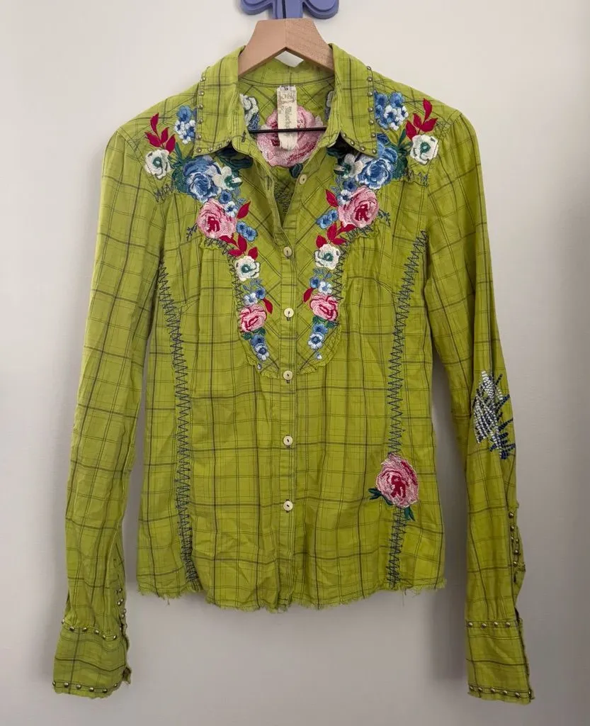 Johnny Was Small Rodeo Rose Embroid Western Shirt Green Plaid Studded Country - $54 - From Most