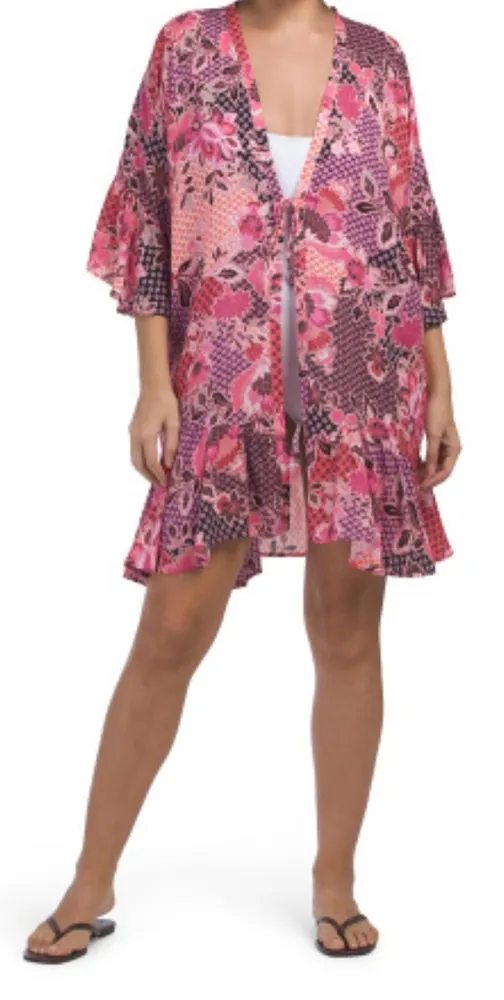 Embrace elegance with this stunning floral pink multi color cover up . Perfect for beach , pool day , boat trip or any adventure. Floral patterns V-neck Tie closure Ruffle details Rayon Brand new Smoke Free home Quick shipping available Comes with red security tag if for some reason return would be approved the red tag must be on.