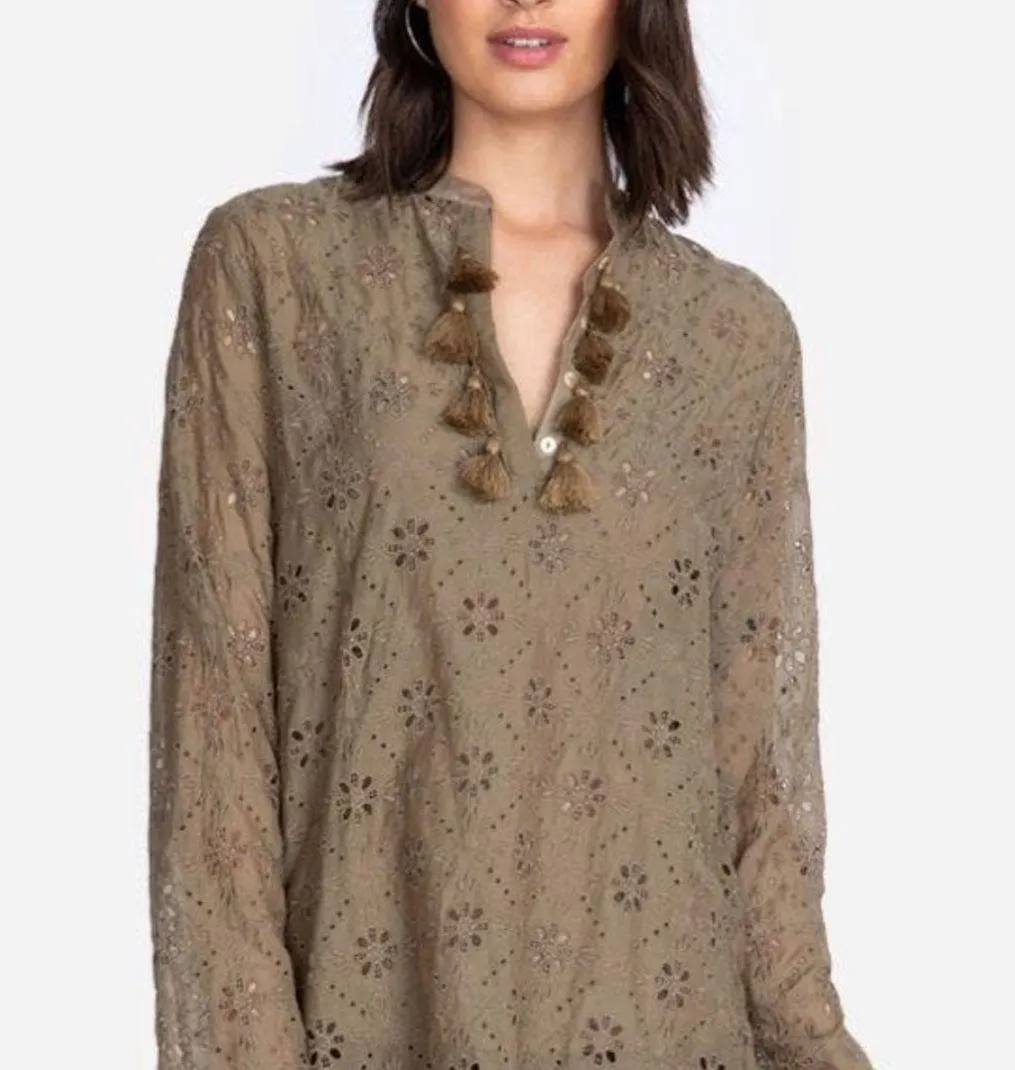 Brand new with tags NWT Size Small Tassel accents bring an added flair to this cotton-silk eyelet top. Mandarin collar Long sleeves Partial button placket front Side vents Cotton/silk Dry clean Imported SIZE & FIT About 30" from shoulder to hem Model shown is 5’10” (177cm) wearing US size Small