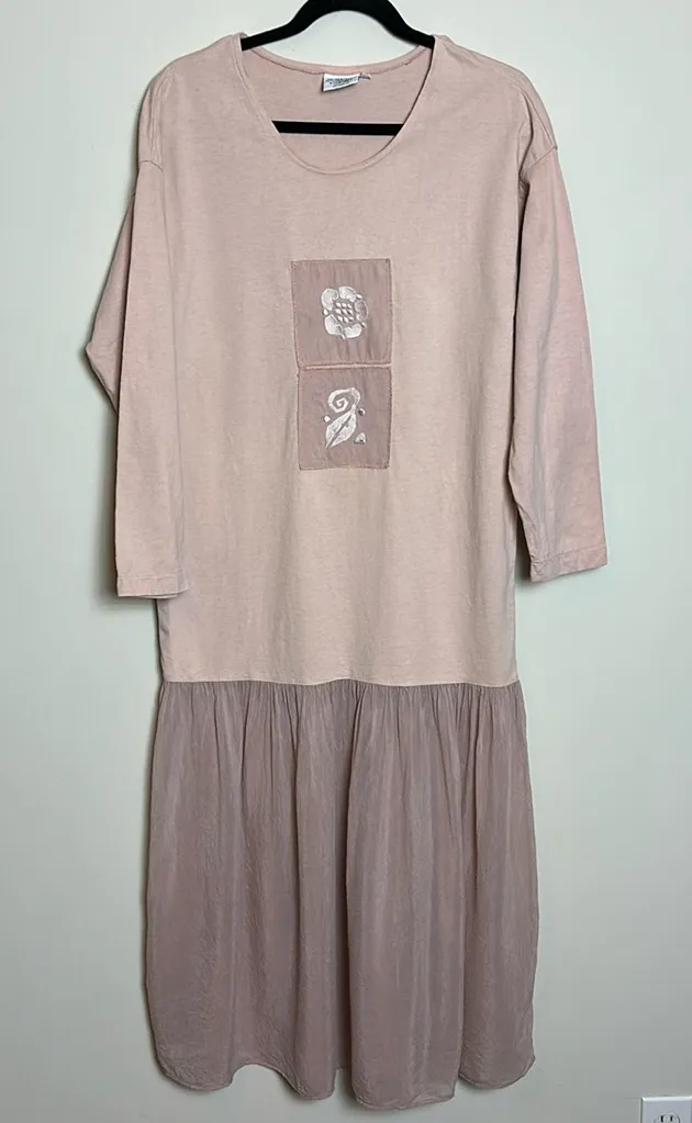 In excellent condition, no flaws, no sign of wear. Vintage t-shirt dress from 1970’s. Top portion of dress is 100% cotton. Bottom is 100% rayon. Embroidered shells on front of t-shirt. Beautiful dusty rose color. Size: Small Color: Dusty Rose Laying Flat Chest: 21” Length: 51” SKU: 420/8
