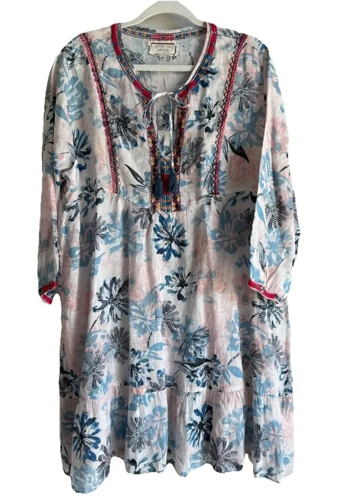 Elevate your wardrobe with this stunning Johnny Was Workshop tunic dress. A-Line in shape, it features a beautiful floral pattern with embroidered trim and tassel details. The V-neckline and 3/4 sleeves add a touch of bohemian charm, while the knee-length cut makes it perfect for any occasion, from travel to party/cocktail and casual outings. Crafted from lightweight ramie material, this dress is both comfortable and stylish. In great preowned condition. Size Large Length 38” Bust 24” Sleeves 19”