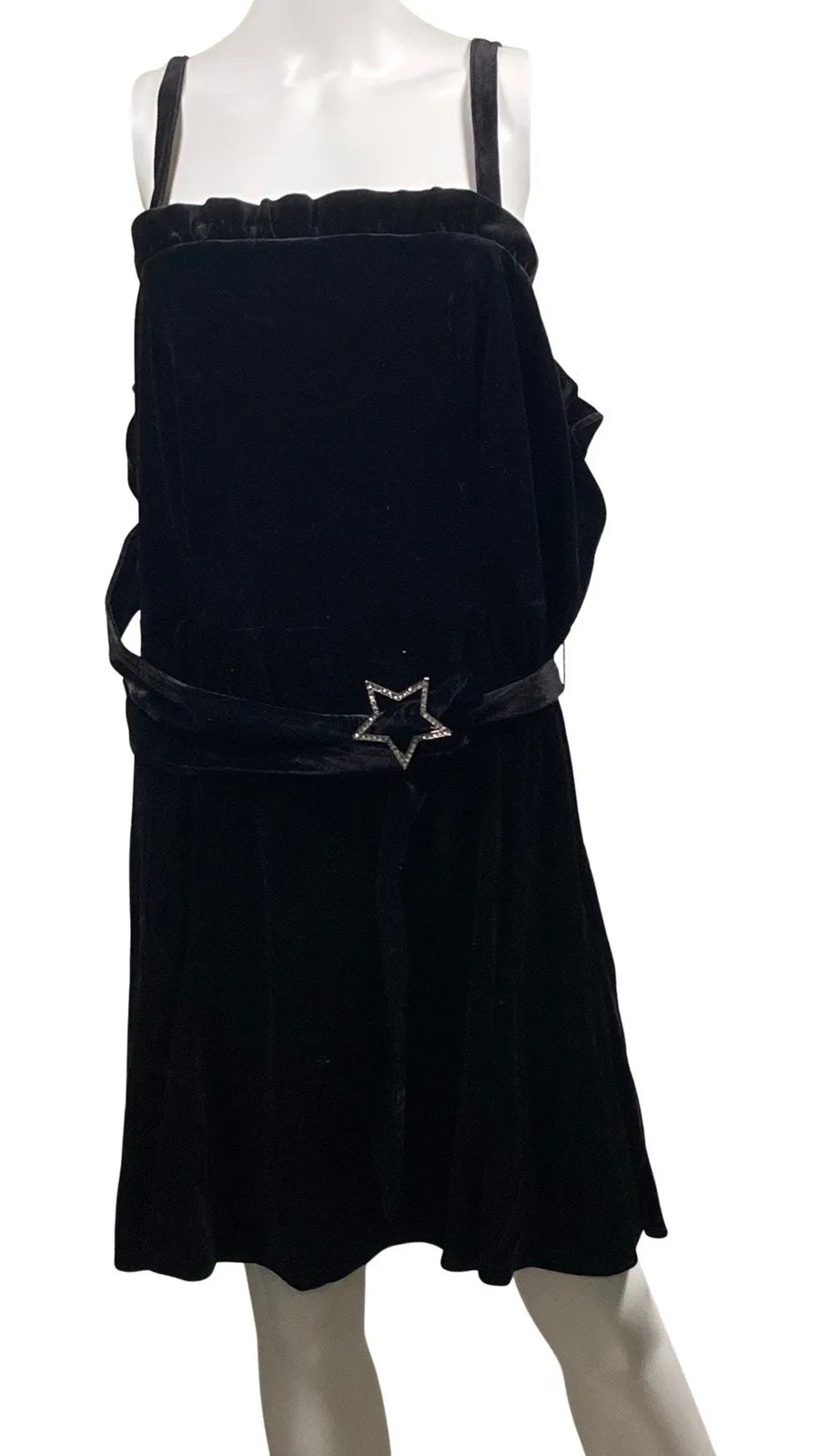 Women’s Johnny Wujek Black Velvet Sleeveless Mini Dress in size 1X – NWT $74. This luxe and flirty dress features a ruffled square neckline, adjustable straps, and a zip-back closure for a flattering fit. The velvet fabric has a soft, rich texture, while the waist tie belt with a rhinestone star buckle adds a touch of glam sparkle. Crafted from 95/5 polyester/spandex with a 100% polyester lining, it offers both comfort and style for any special occasion or night out. Measurements: PTP 22", waist 38", length 36". Keywords: Johnny Wujek dress, black velvet mini dress, plus size party dress, ruffle neckline, rhinestone belt, holiday outfit, cocktail dress, evening wear, adjustable straps, NWT.