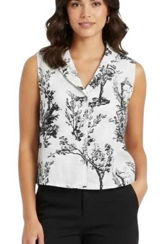 -White with black toile scenic print. -Buttons in front. -Collared. -Sleeveless. -100% linen. Appro... Show more