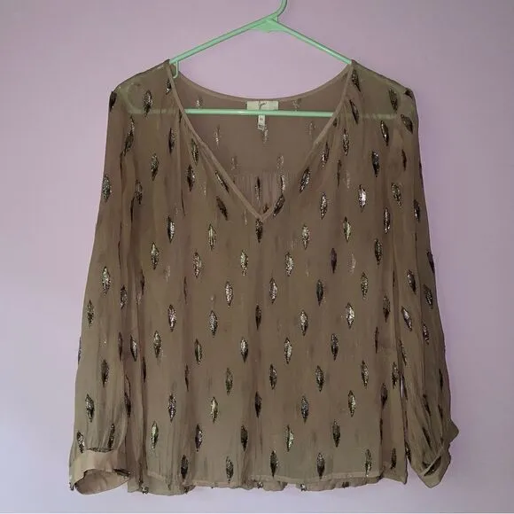 Features - split v neckline - button wrist cuffs - metallic pattern - oversized fit Flat measureme... Show more