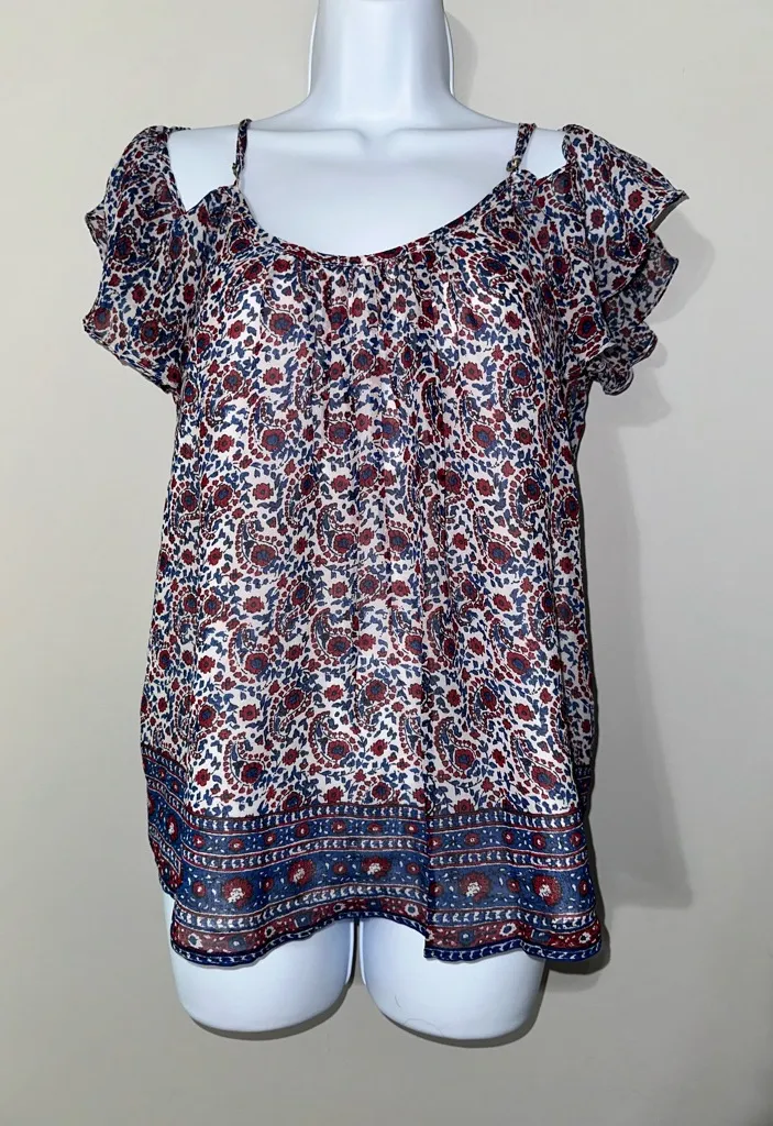 The Joie 100% Silk Spaghetti Strap Cold Shoulder Ruffle Top is a stylish and elegant blouse designed... Show more