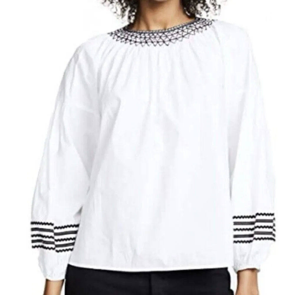 Brand: Joie Description: Cotton embroidered trim puff sleeve blouse Size: xs Color: white and bla... Show more