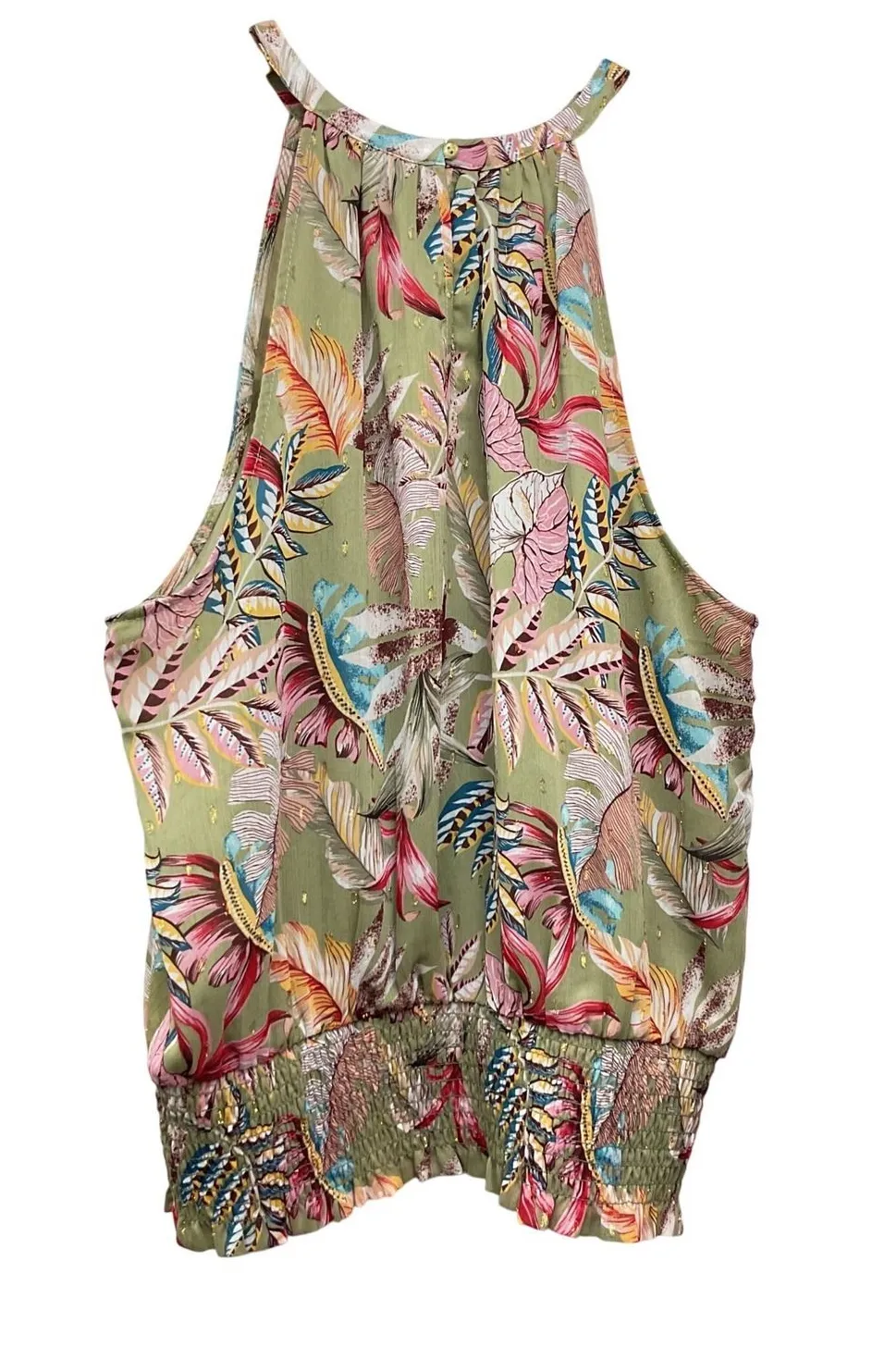 Joie tropical leaf print halter tank top. This sleeveless blouse features a vibrant green base adorn... Show more