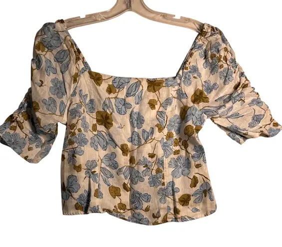Joie linen cropped top in a white base with a blue and olive green floral print. Features a flatteri... Show more