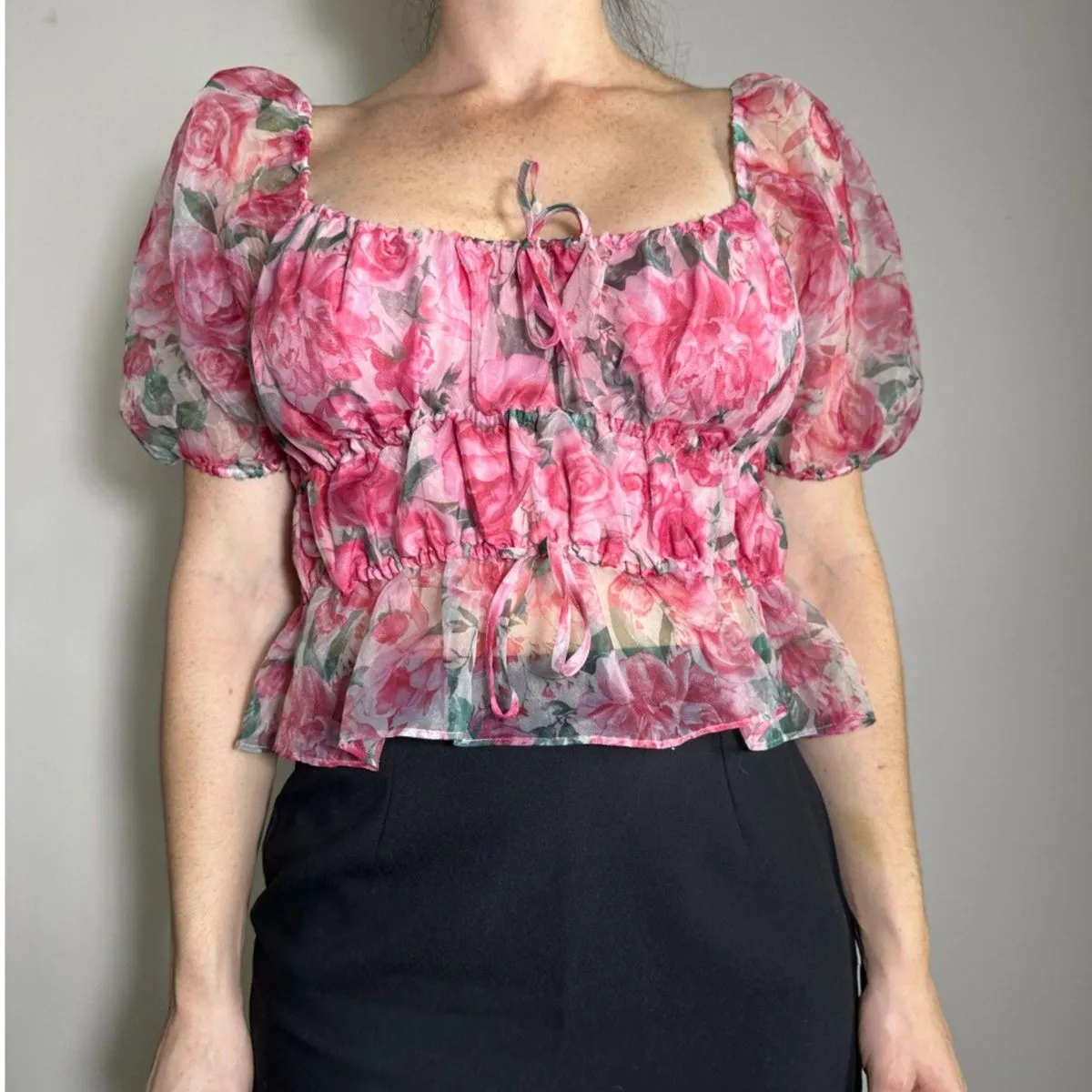 joie pink semi sheer pink floral puff sleeve peplum top size small - $27 - From Thrifted