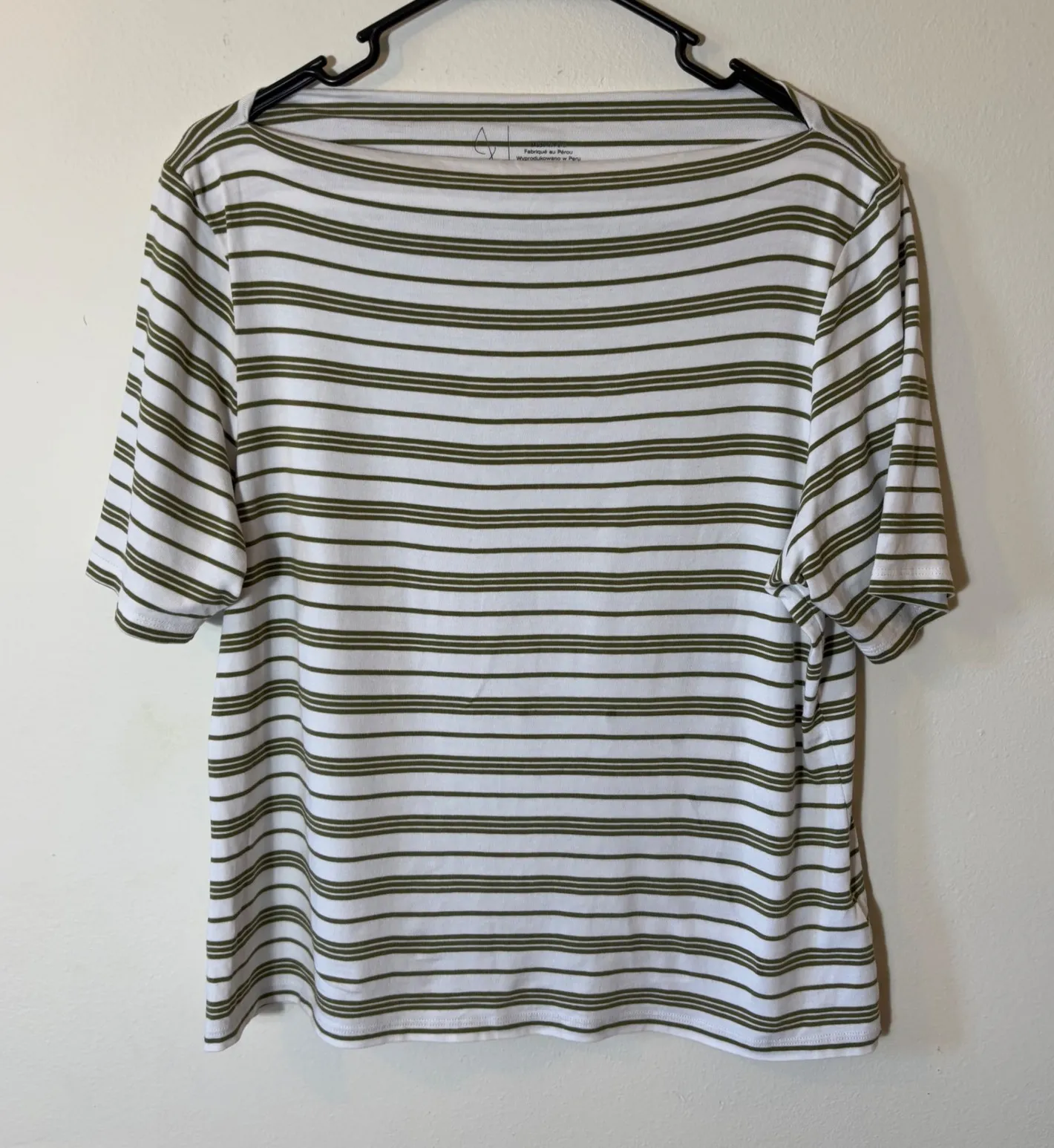 Keywords: Joie, Striped Tee, Boat Neck Top, White Olive Green Shirt, Short Sleeve Top, Casual Top, Womens Top, XL Top, Extra Large Top, Cotton Blend Top, Relaxed Fit Top, Striped Shirt, Coastal Style, Minimalist Fashion, Everyday Top