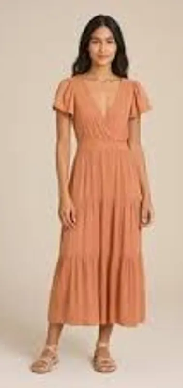 JOIE tiered midi dress Surplice neckline with flutter sleeves Elasticized waist with tassel ties... Show more