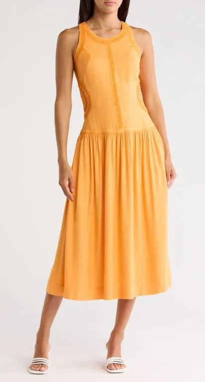 Sleeveless sundress with back zip closure. Crochet trim and cutouts on sides of body. Measures 15.... Show more