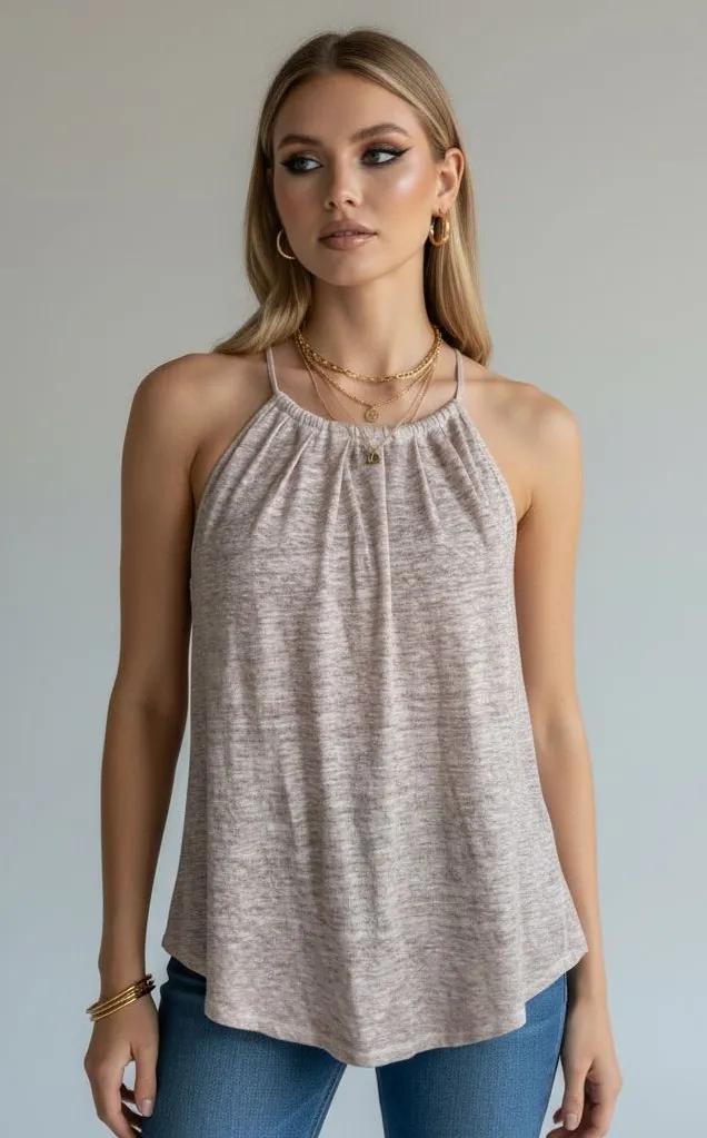 Elevate your wardrobe with this chic beige sleeveless top. Perfect for any occasion, its soft fabric... Show more